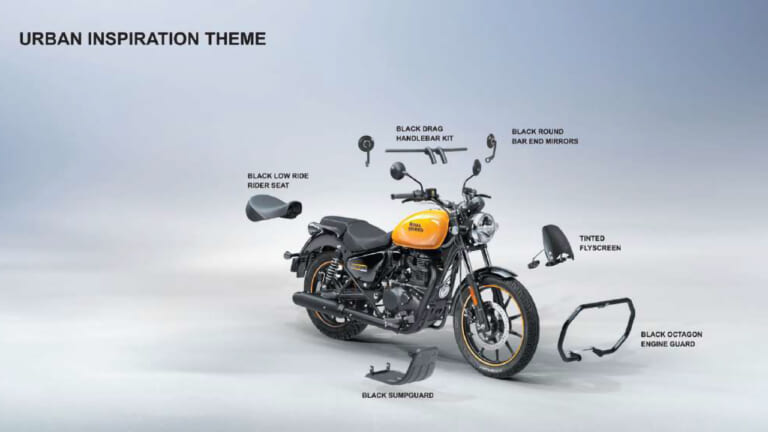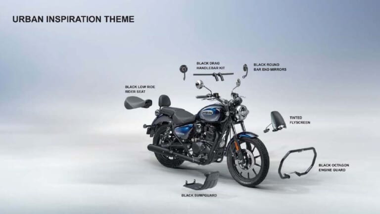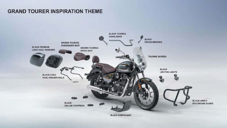 2026年モデルのメテオ350には、各バリエーションの個性を引き立てる純正アクセサリー「Royal Enfield Accessories」(2つのテーマで構成)も用意される。「Urban Kit(アーバンキット)」にはブラックのドラッグハンドルバーにブラックのバーエンドミラー、ローライダーダーシート、スモーク・フライスクリーンなどを装備。一方の「Grand Tourer Kit(グランドツアラーキット)」には、ブラウンのツーリングシート、ブラックのプレミアムパニアとパニアレール、デラックスフットペグ、ブラックのツーリングハンドルバー、LEDフォグランプなどを含み、より本格的なツーリング仕様を実現する。