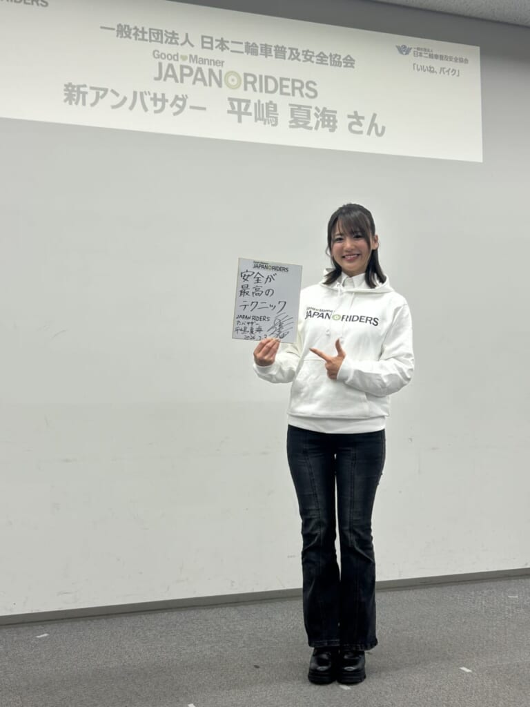 一般社団法人日本二輪車普及安全協会は元AKB48のメンバーで、現在はマルチタレントとして活躍中の平嶋夏海(ひらじまなつみ)さんが、2026年より「JAPAN RIDERS」の新アンバサダーとして就任することを都内で開いた報道発表会で明かした。