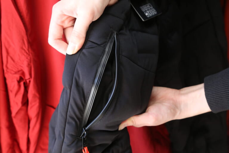 ポケットも多数装備。フロントのポケット右側にはスマホ専用のポケットも内蔵する。サイドのファスナーポケットは500mlも楽に入る大容量サイズだ。