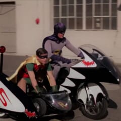テレビ放送当時のバットサイクル。バットマンはともかく、ロビンのポジションは微妙なニュアンスです(笑)