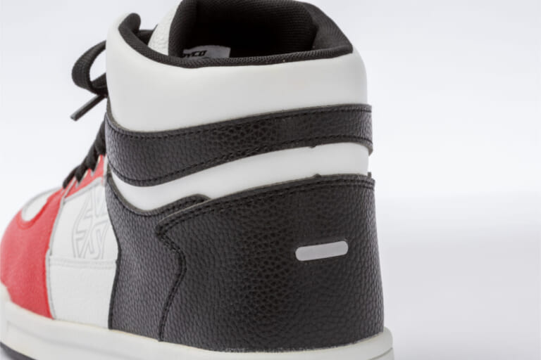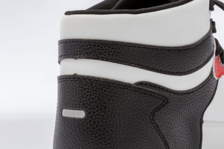 ハイカット形状により足首周辺を包み込み、シューレースをしっかり締めればフィット感も高い。万一の衝撃でシューズが脱げにくい構造とした点も、ライディング専用品ならではの設計だ。かかと部には反射材を配置し、夜間走行時の被視認性向上にも配慮する。