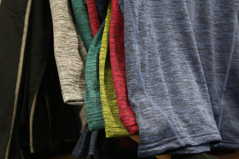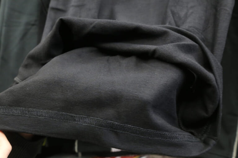臭いが気になりにくい抗菌防臭仕様で、クルーネックの首元は「アウター見え」を意識した、トレーナー風の太めの襟幅のデザインになっている。