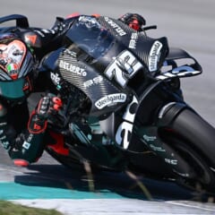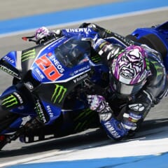 パープルを基調としたテスト用ヘルメットでセテストに登場したファビオ・クアルタラロ。2025年レプリカも販売中