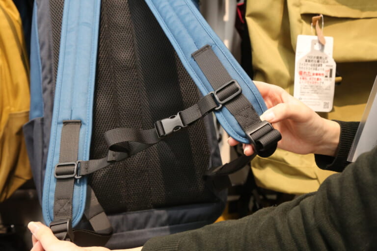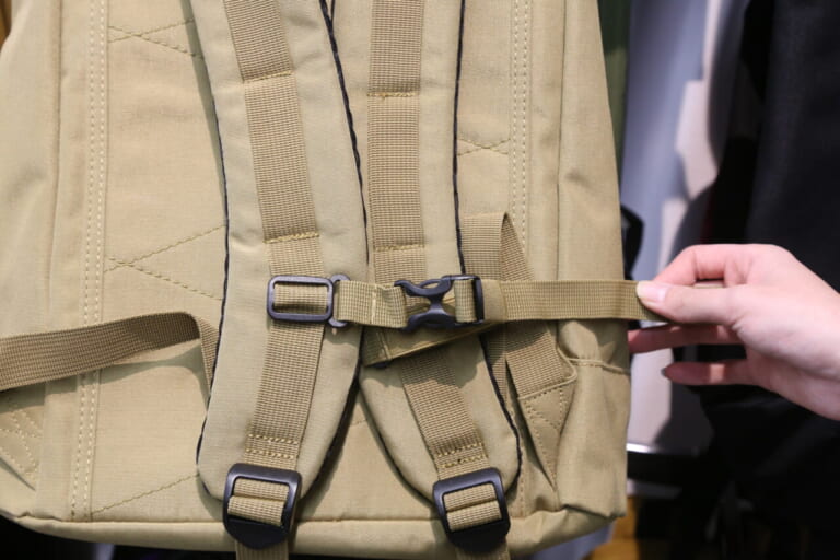 肩のベルトには背負ったときの負担を軽減でき、ライディング時のバッグのズレも防げるチェストベルトも装備する。