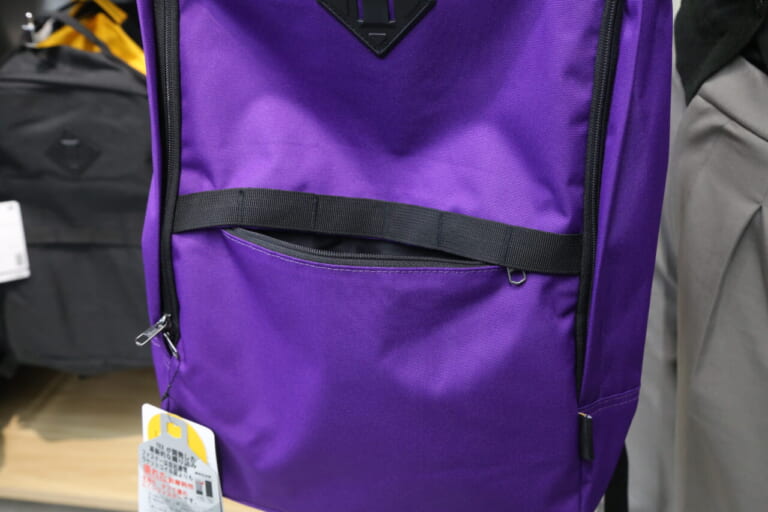 フロント側にはお財布やスマホなど小物類を楽に出し入れできるファスナーポケットを用意。