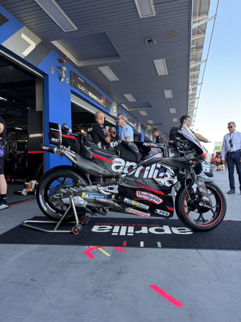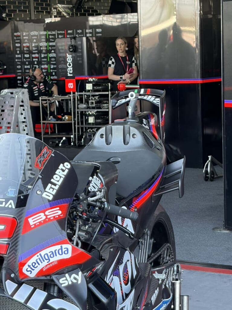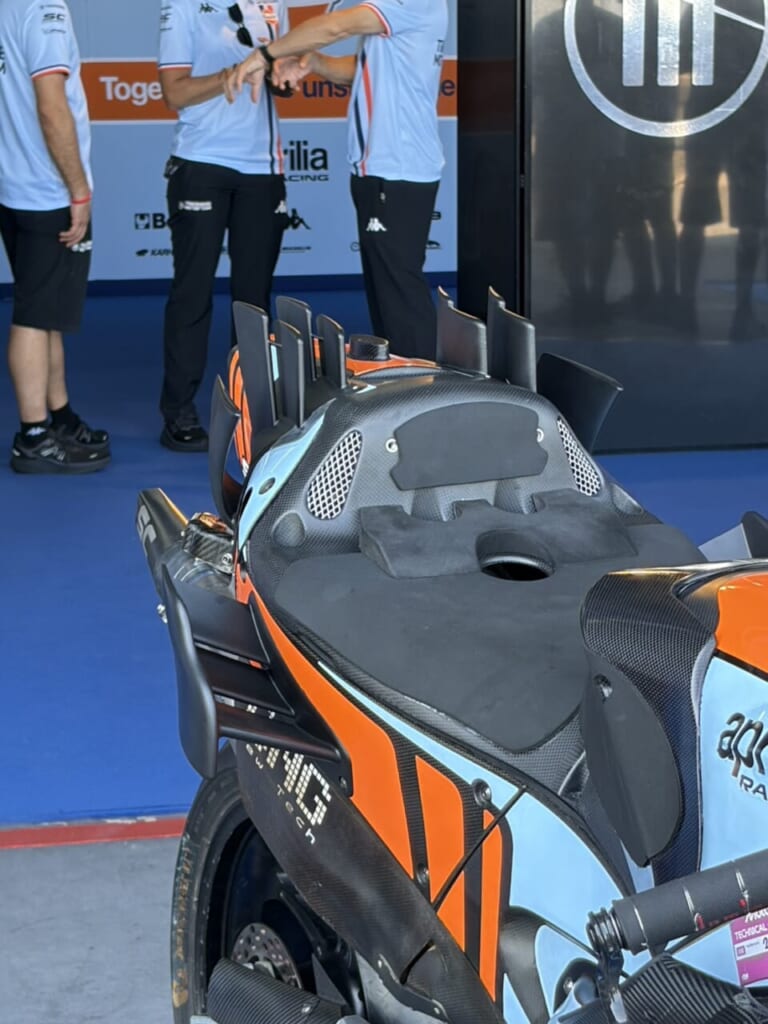 アプリリアはリヤウイングにご執心の様子。ファクトリーマシンには四輪F1のようなゲート型が、サテライトにはステゴザウルスの進化版・パノラミクス型が装備されていた。小椋藍くんに聞くと「あ、ホントだ」と、気付いていませんでしたが……。