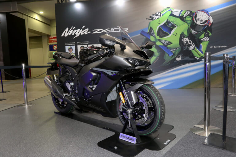 お次は今年夏頃に発売予定と発表になった、Ninja ZX系のフラッグシップ・Ninja ZX-10R。スーパーバイク世界選手権で6度の栄冠を獲得した実績を誇るそのチャンピオンの最新モデルも、会場で間近に見ることができた。