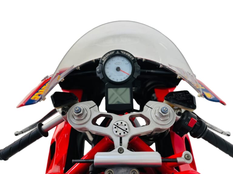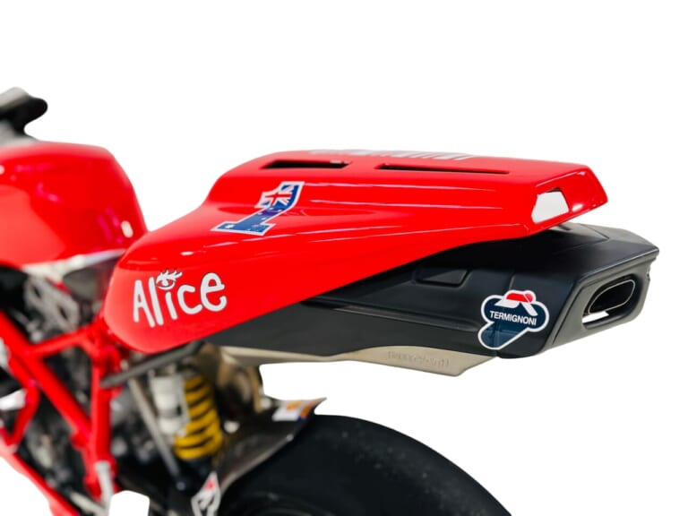 当然、ベース車両のマニェッティ・マレリ製計器、ショーワ製リアショックアブソーバー、およびブレンボ製ブレーキシステムといったコンストラクションが踏襲された上で、GP7のボディワークがそのまま架装されています。このあたりのフィッティングはさすがファクトリーといったレベルで、近くで見てもワークスマシンとの違いはほとんどわからないほどだとか。