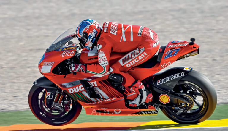 2007年にケイシー・ストーナーがファクトリーライダーになるまで、モトGPにおけるドゥカティは苦戦を強いられていました。直線は速いが、曲がらないというレッテルを貼られ、口さがない批評家は「市販車と同じく気難しい」などとコメント。