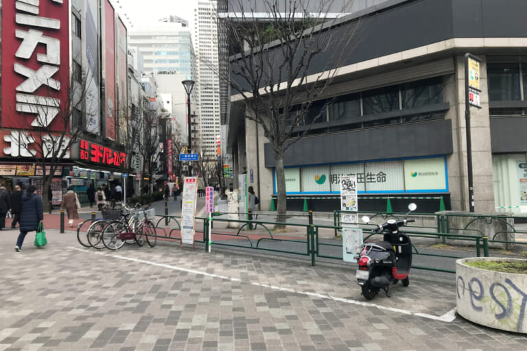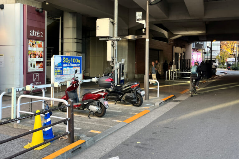 新宿区が西新宿の歩道に設置していた契約自転車等駐車スペース。原付一種(50cc以下)は契約できたが、原付二種以上のバイクは契約できなかった(2020年取材当時)。当時の新宿区担当者に自動二輪車ユーザーの声は届いていなかった。
