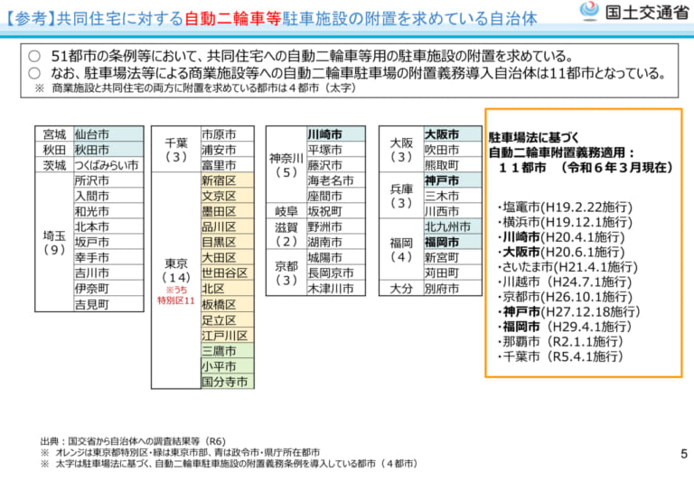 マンションなど共同住宅に対して自動二輪車(125cc超)駐車スペースの附置を求めている51都市のリスト。オレンジ枠(筆者加筆)は駐車場法に基づき自動二輪車附置義務条例を制定している地方公共団体11市のリスト ※都市局街路交通施設課の提出資料「自動二輪車等駐車場の現状等について」5Pより一部加工・引用