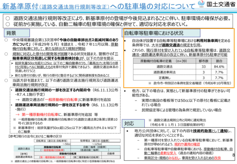 道交法施行規則等改正に基づいた新基準原付への駐車対応。自転車等駐車場の約85%は駐車可能な排気量を道交法での原付一種区分に基づいた50cc以下としているため、地方公共団体が所管する多くの自転車等駐車場には新基準原付(50cc超125cc以下、最高出力4.0kW以下)が駐車できない。このねじれを改善することが求められている ※都市局街路交通施設課の提出資料「自動二輪車等駐車場の現状等について」8Pより一部加工(オレンジ枠は筆者加筆)・引用