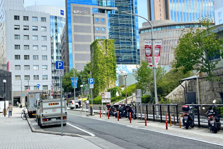 一方通行路の歩道を切り込むことで、バイク用路上駐車場を各地に設置している神戸市。トラックの荷捌き用スペースも設置されており、国交省の思い描く道路空間が理想的に再現されている。