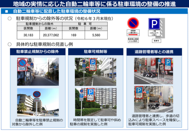 2022年3月、警察庁は都道府県警察等に対して「地域の実情に応じた自動二輪車等に係る駐車環境の整備に向けた継続的な取組の推進について」という通達を発出し、駐車禁止規制から「2輪を除く」など、バイク駐車環境の整備推進について具体的な取り組みを示している。 ※警察庁の提出資料「警察における自動二輪車等に係る駐車環境の整備に向けた取組について」より引用