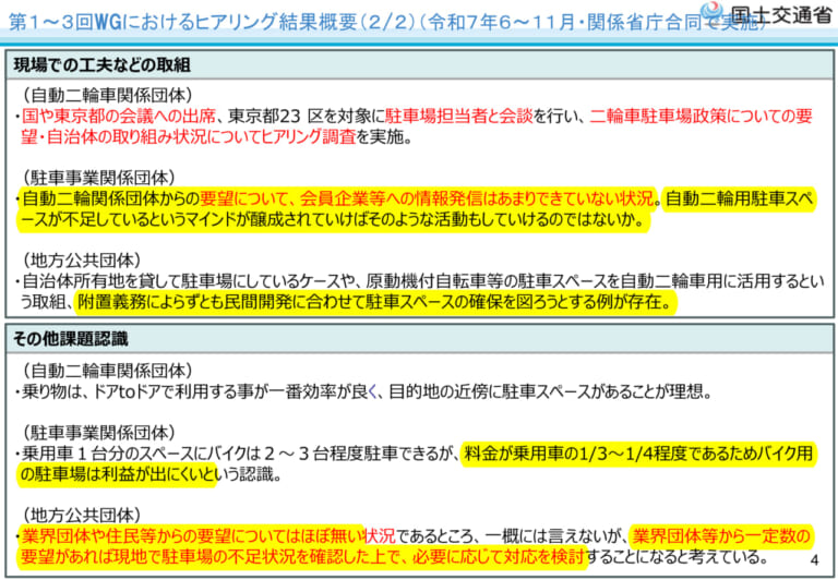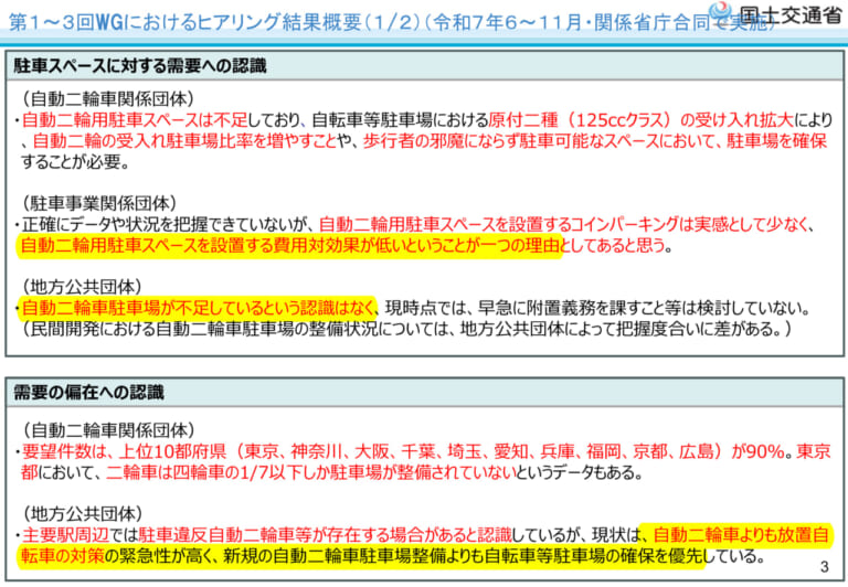 WGでは、二輪業界団体(6/4実施)、駐車場事業関係団体(10/9実施)、地方公共団体(11/12実施)とのヒアリング結果を共有した。ヒアリングでは、二輪業界団体と地方公共団体の間に認識の相違があることが判明した。