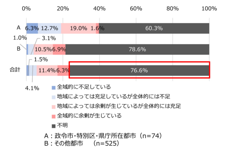 都市局が実施した地方公共団体への調査結果で、自動二輪車駐車場の需給状況については、全体の約77%が「不明」と回答した。 ※都市局の提出資料「第2回市街地における自動二輪車等の駐車スペース確保に係る関係省庁連絡会議 説明資料」7Pより引用