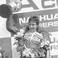 1982年のデイトナ100マイルレースで優勝したフレディ・スペンサー。2位:マイク・ボールドウィン、3位:ロベルト・ピエトリと、ホンダが表彰台を独占。