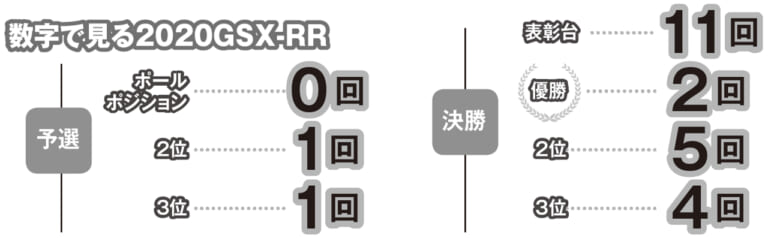【数字で見る2020GSX-RR】ご覧いただければ分かる通り、GSX-RRの予選は今ひとつ。そして決勝でもジョアン・ミルとアレックス・リンスが1勝ずつ。ズバ抜けた速さではなく、着実に上位を走る安定性が王座獲得を呼んだ。