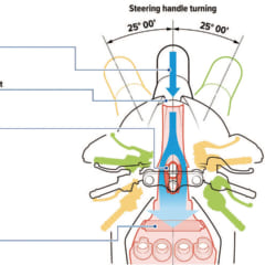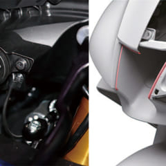 もちろんダクトのデザインにも、最新の空力研究結果が反映されている。センターラムエアダクトとストレート経路を実現するため、トップブリッジ部にあったキーシリンダーはスマートキー化しながら移設。さらに、ハンドル切れ角は左右各25度に抑制された。センターラムエアダクトによって顔がレーシーになっただけでなく、トップブリッジのキーシリンダーが廃されたことでハンドル周辺もレーサー風に!
