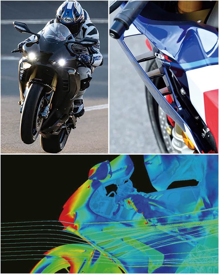 【ウイング効果は体感できるか?】RR-Rのフェアリングには、MotoGPワークスマシンのRC213V(’17~’18年型)からフィードバックされた技術を用いて設計されたダクトウイングが装備されている。200km/hからの加速でも前輪が浮き気味になるほどのパワーを持つRR-R。メーカーによると、ウイングはダウンフォースを発生させ、4速までの加速で0.6秒速いとのことだが、着脱できる機構ではないため、有無による効果の差を体感することはできなかった。逆に言うと、ライダーが感じる空力特性は一般的なスーパースポーツ車と同様で、わざと高い角度までウイリーさせたり、高速周回路のバンク最下段から200km/hくらいの速度でコーナーを立ち上がってみたりしても、不自然な車体挙動はない。