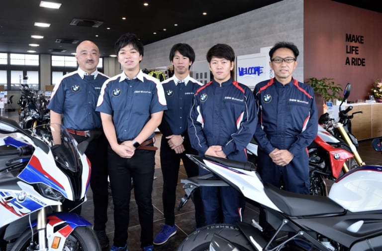 Motorrad Gifuオープニングスタッフ。左端が金光好樹店長で、他は若いスタッフが揃う。