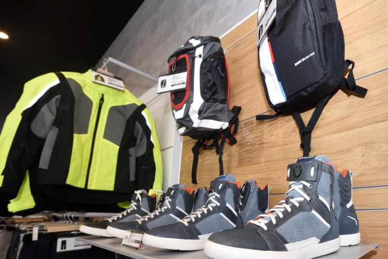 【純正アパレル大量在庫】ライディングギアを豊富にラインナップするBMW。Motorrad Gifuでは、純正ライディングギアを大量に在庫し、試着室も完備。身に付けるものだから、実物を試着できるのは嬉しい。