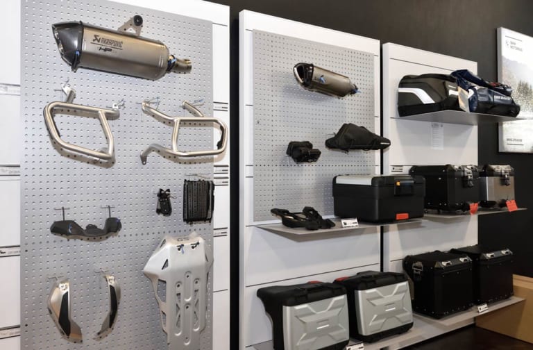 【純正オプション装着もお任せ】ヨーロッパのバイクメーカーは、多くの純正オプションパーツを用意しているが、BMWはその筆頭。ケースやガード類といったツーリングユースに欠かせないパーツだけでなく、マフラーなどのパフォーマンスパーツもメーカー純正品で揃えられる。