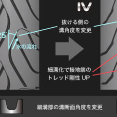ウェットや低温時のグリップ力に貢献するシリカを増量。さらにトレッドパターンの見直しと合わせて、雨天走行の安心感は絶大だ。