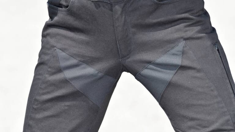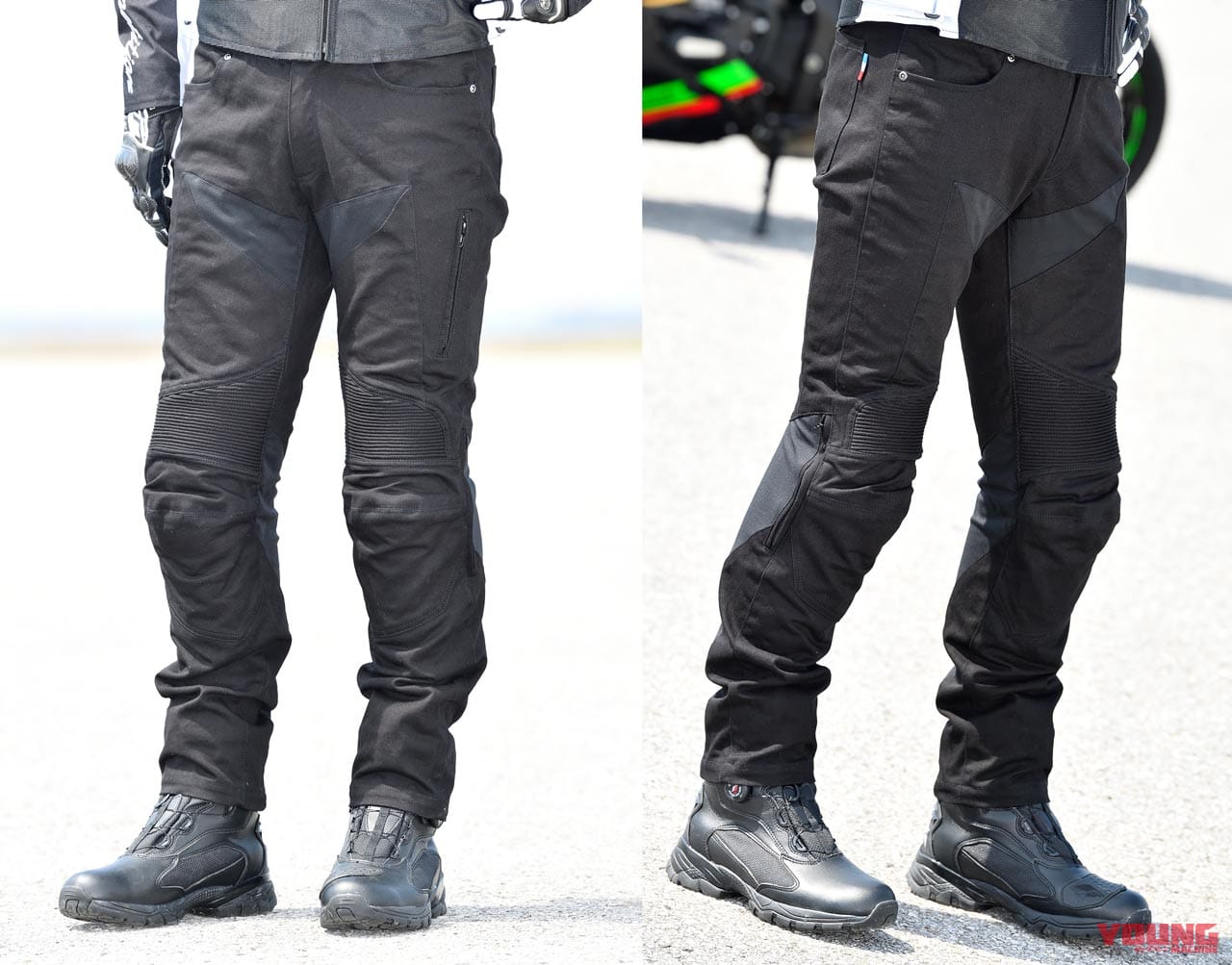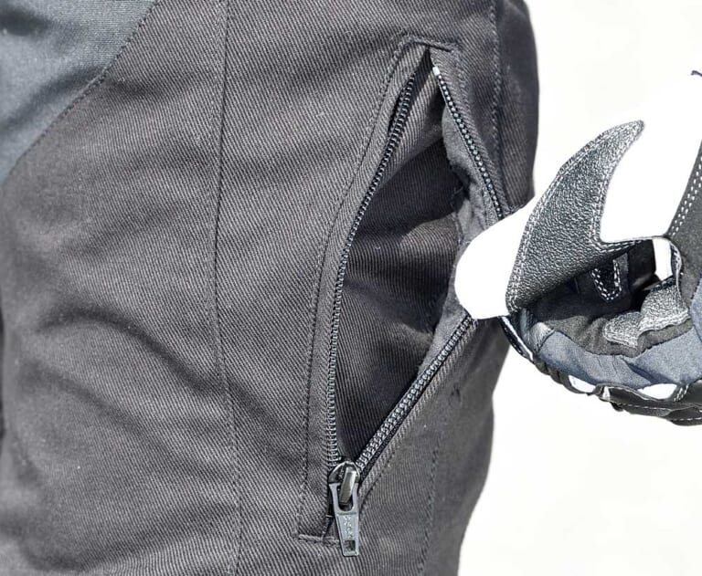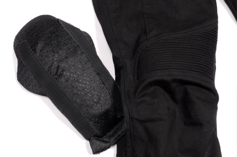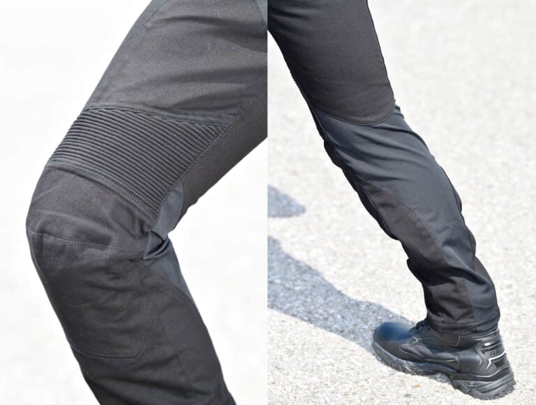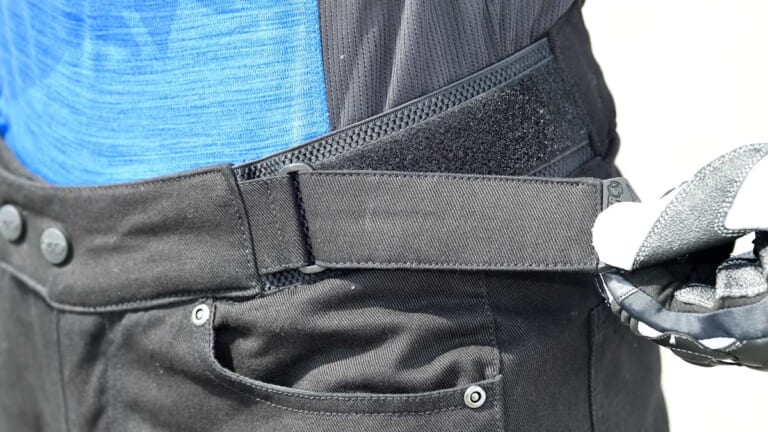 膝には保護能力の高いCE規格のプロテクターが標準装備されており、これは位置の微調整まで可能だ。ウエストにはレザーパンツと同様にベルクロ式のアジャスターがあり、しっかりとフィットさせられるのが嬉しい。