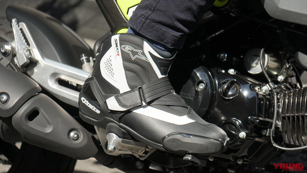 TPF(トランスバーサルプロテクションフレーム)を採用したソールは、ライディング時に安心できて確実なステップワークにつながる高い剛性を誇るが、母趾球あたりで適度にしなり、しかもアキレス腱付近にストレッチパネルを設けつつ上部をカットした構造を採用しているため、ツーリング先での歩きやすさも備える。さらに、ベルクロストラップと内足側ジッパーの2アクションで簡単に脱ぎ履きできる。