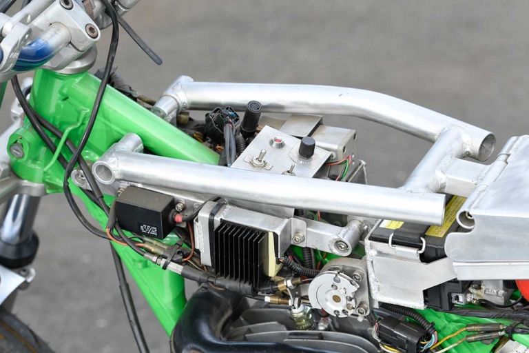 「気体燃料で着火の早いことなどを考えると、水素燃料の供給はインジェクションの一択になります。当社にはインジェクションのノウハウが無かったので、基本的なシステムの構築は、水素燃料仕様のエンジンを手がけた実績がある、広島のFCデザインさんにお願いしました。ただしFCデザインさんにとっても、2ストローク+水素燃料は初の試みですから、すぐに実走が出来たわけではありません。テスト中に最も大きな問題になったのは、クランクケース内で起こるプレイグニッション=早期着火で、これを解決するために、インジェクターの取り付け位置と燃料噴射量の見直しは何度も行いました。結果的にガソリンと同様のエンジンフィーリングを実現するまでには、数年の歳月がかかりましたね」