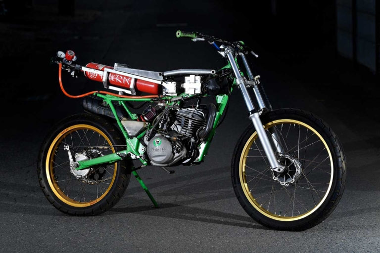 ベース車両にTY250スコティッシュを選んだ理由は、シートが低いトライアルバイクなら、水素ガスのボンベを搭載してその上に座っても、足つき性が確保できると考えたから。