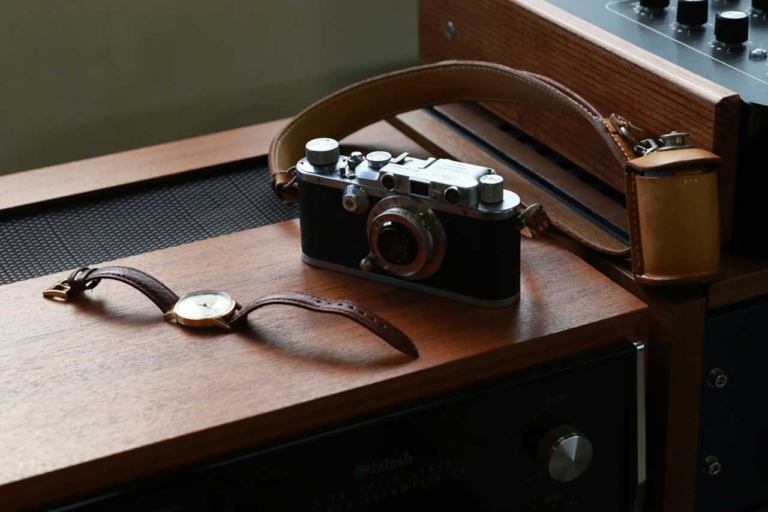 井上さんが整備を重ねながら愛用している逸品。フィルム式カメラは1935年型ライカ・バルナックⅢaで、純正レンズは以後の35mmフィルムカメラの基本を作ったエルマー5cm F3.5。スモールセコンド付きの機械式時計は1950年代のスミス・デラックス。