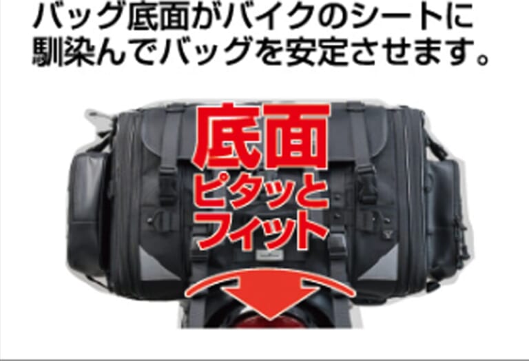 シート形状に沿う底面設計を採用。装着時にバッグの底面がシートへピタッとフィットし、走行中のズレや浮きを抑える。積載時の安定を重視するツーリング派にとって、安心感の高いポイントだ。