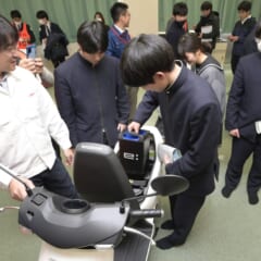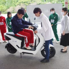 「ホンダ EM1 e:」に試乗する高校生。埼玉県立秩父農工科学高等学校で開催された「高校生と考えるカーボンニュートラルと電動モビリティ」試乗会(2024年3月)より