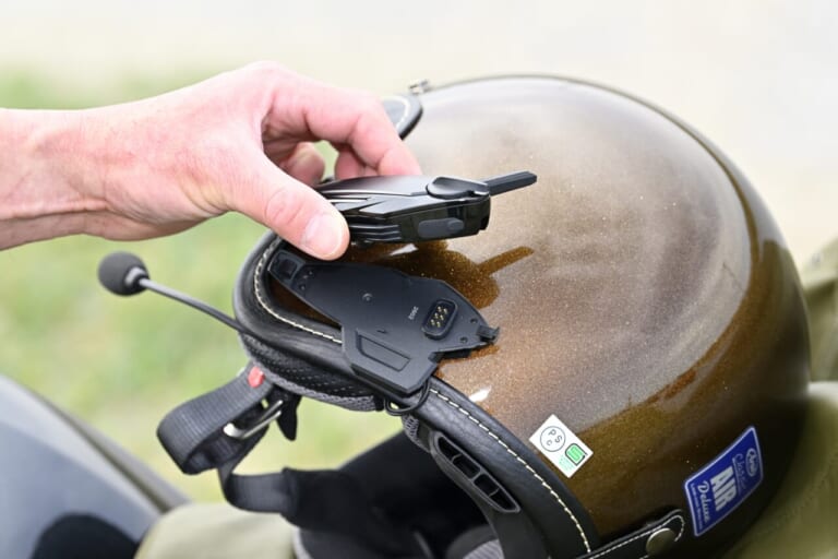 新型『B+COM 7X EVO』は本体の装着方式も変更。従来のスライド装着方式からマグネットクレードルとなった。加えてスピーカーやマイクへの配線接続が本体からベースに移ったことで、本体の着脱が秒で行えるようになったのだ。