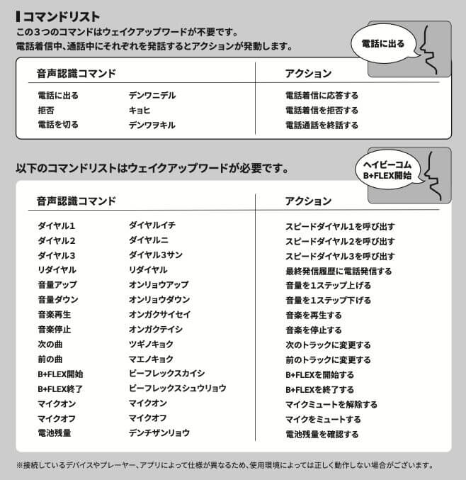 バイクに跨る際など両手が使えない状況でも「ヘイB+COM! 音楽再生!」などと特定のコマンドをしゃべってスマートフォンや『B+COM 7X EVO』を操作するボイスコマンド機能を搭載。