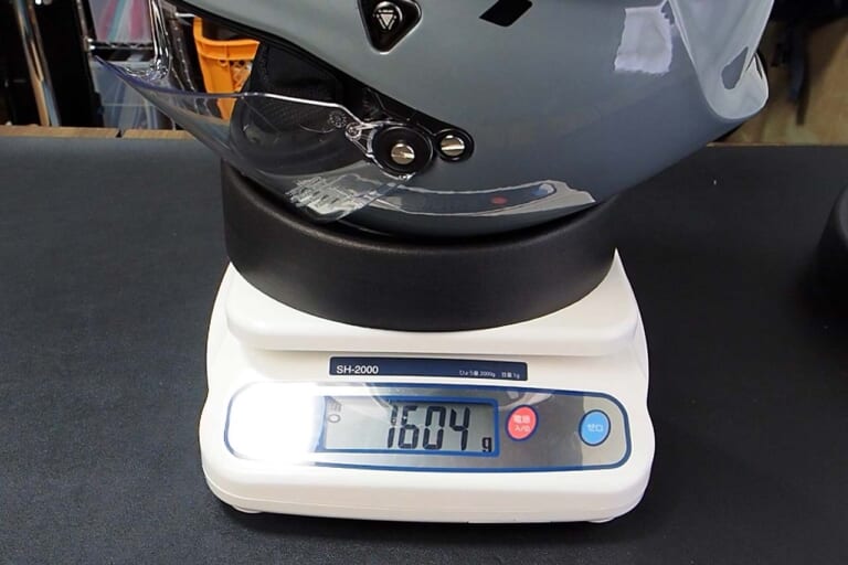 今回はバトルシップグレーのMサイズを測定してみたところ、1604gでした。一般的なアドベンチャーヘルメットに比べて軽い印象ですが、バイザーをつけてないからでしょう。