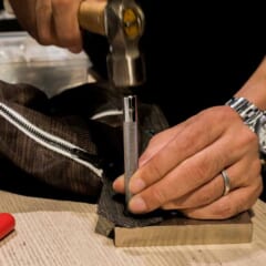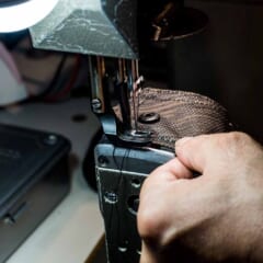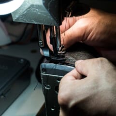 新しい金具をつける(左)ミシンで縫う(右)