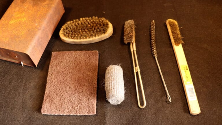 メジャーなところではやっぱり「ワイヤーブラシ」を使うことになるでしょうか。擦るところによって形状を選ぶことができ、硬さも様々です。または「研磨パッド」。これは柔らかくて耐久性があるので、曲面やパイプ形状にとても便利なもの。もしくは「ボンスター(スチールウール)」もあります。粉が落ちるのが弱点ですが、かなり頼れるナイスガイです。