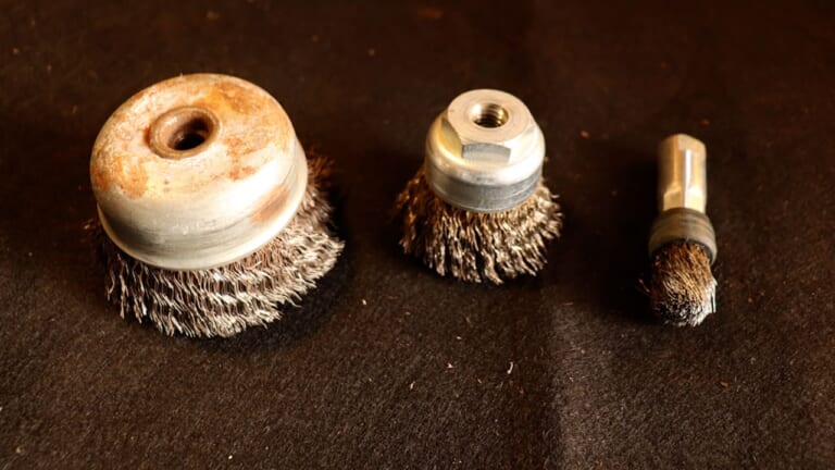 「カップブラシ」とは、ワイヤーブラシの毛(ワイヤー)が円形になっていて、回転しながら対象物を磨けるアイテムです。このカップブラシにもいくつかの大きさがあって、今回使ったサイズのものから、中型、そして細い小型まであって、磨きたい対象物の大きさや、磨く箇所に応じて選ぶこともできます。
