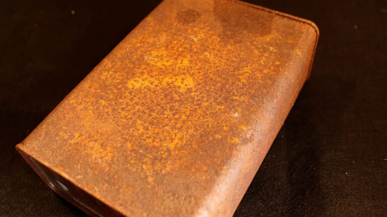 いきなりですが、ここにサビサビになってしまった缶があります。捨てるのを忘れていて、雨ざらしに遭って、こんな見事な錆の花(?)を咲かせてしまいました。