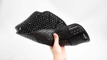 通常は柔らかいけど衝撃を受けると硬化する性質があるため、ゴツくない、スマートなスタイリングを実現できるのです。画像のようにぐにゃりと曲がるということからも、柔軟性がわかるでしょう。