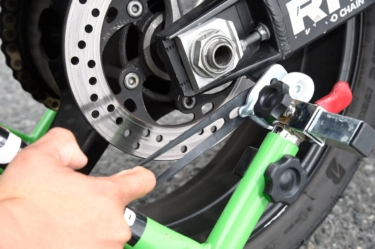 タイヤ取り付け時も同様で、アクスルシャフトの高さまで坂を上げれば、あとはシャフトを差し込むだけ。シャフトを差し込む前にドライブチェーンをスプロケットにかけておけば、タイヤが下がることもない。