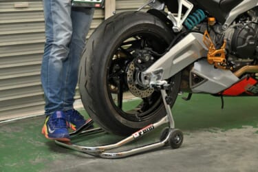 リンクまわりの清掃やハブダンパーのチェックなど、リヤタイヤを外せばできると分かっていても、「タイヤの着脱が面倒で…」と二の足を踏むサンデーメカニックは少なくないだろう。たとえメインスタンドがあっても、タイヤの下につま先を差し入れたり、抱えて持ち上げながらアクスルシャフトの位置を合わせるのはなかなか面倒だ。