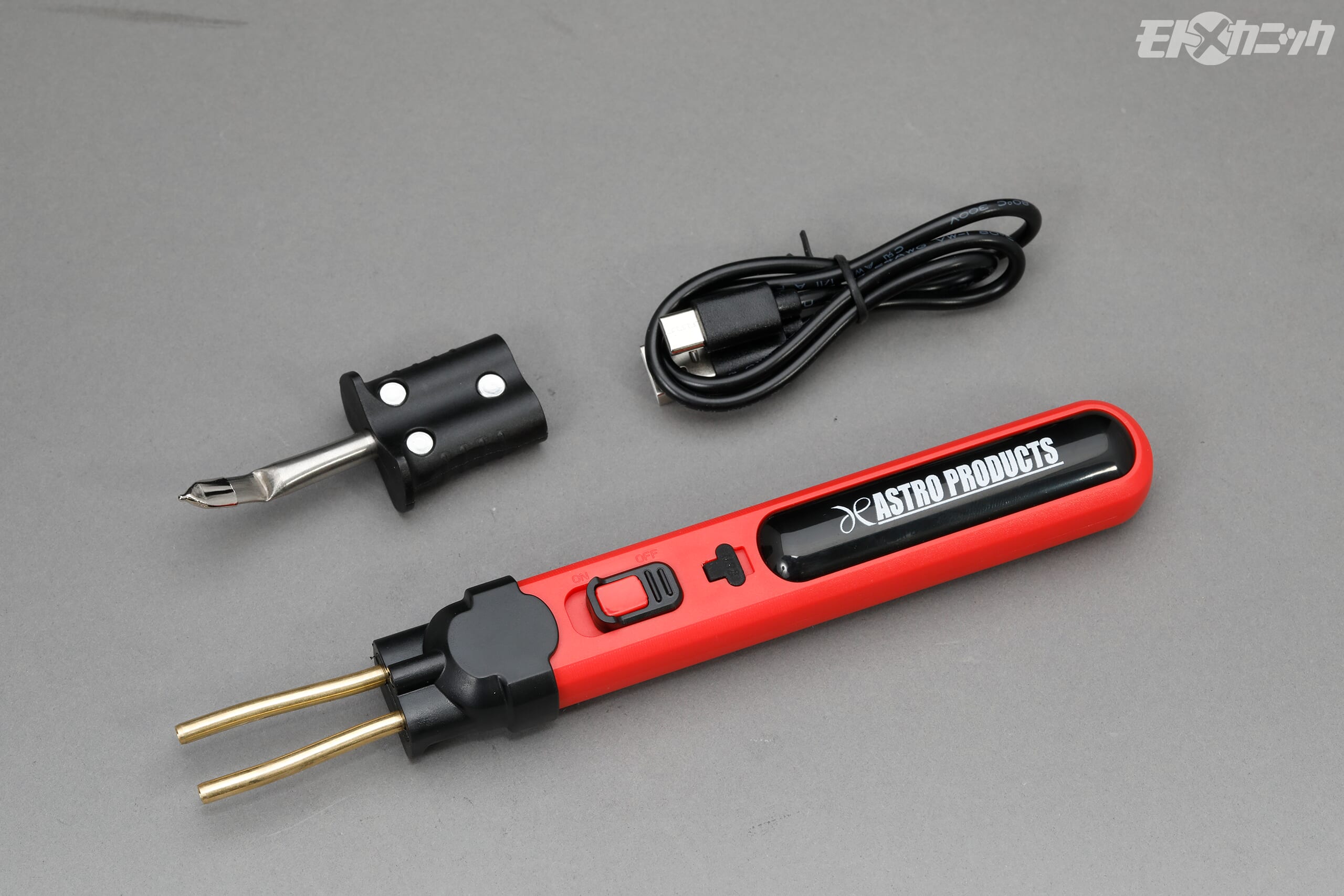 付属のコテアタッチメントは別売りのプラスチック溶接棒を溶かすだけでなく、ハンダごてとしても使える。わずか数秒でハンダ溶解温度に達し、電源ボタンを押している間だけ通電するので消し忘れの心配も無用。