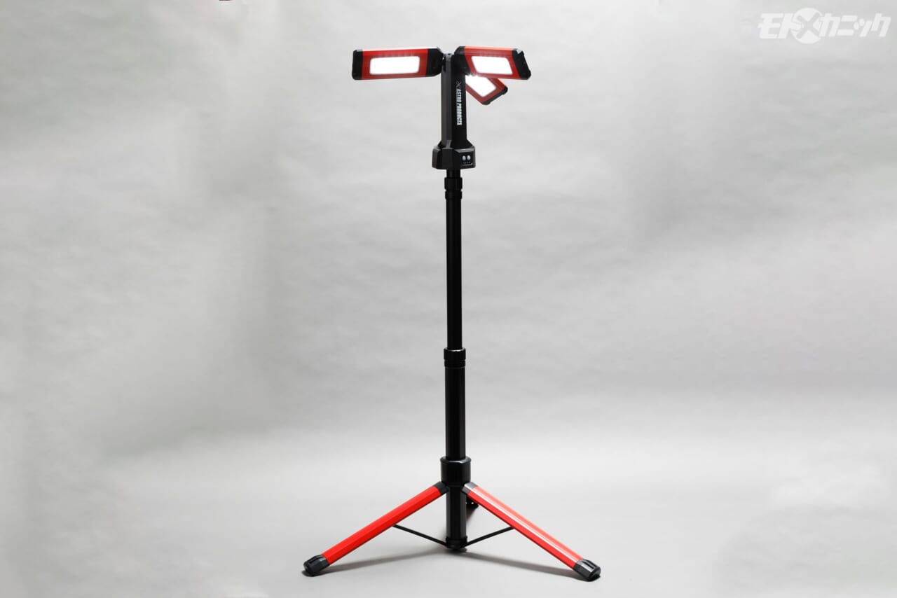 大光量が自慢のLEDのワークライトは数多くあるが、ライトの固定方法が決まらず使い勝手がイマイチ…ということも少なくない。3面折り畳み式で最大2000lmの明るさを誇るこの製品は、専用の三脚が付属するのが最大の特長。