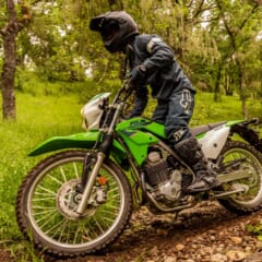 【'23 KAWASAKI KLX230 SM】■空冷4スト単気筒SOHC2バルブ 232cc 19ps/7600rpm 1.9kg-m/6100rpm ■136kg シート高845mm 7.4L ■タイヤF=110/70-17 R=120/70-17 ●色:エボニー ●価格:57万2000円 ●発売日:2022年10月15日