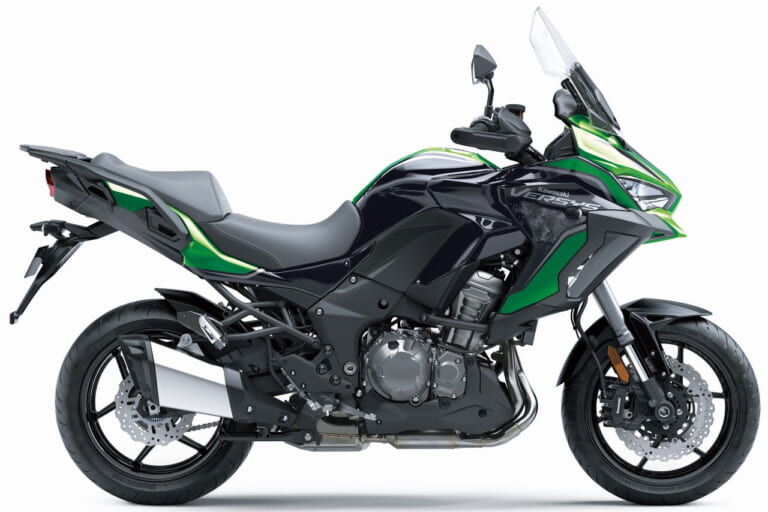 【’21 KAWASAKI VERSYS 1000 SE】水冷4スト並列4気筒DOHC4バルブ 1043cc 120ps/9000rpm 10.4kg-m/7500rpm ■257kg シート高820mm 21L ■タイヤF=120/70ZR17 R=180/55ZR17 ●色:エメラルドブレイズドグリーン×メタリックディアブロブラック ●価格:199万1000円 ●発売日:2021年7月16日