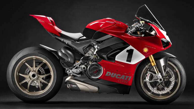 「パニガーレV4R」はスーパーバイクレースの規定に合致する998㏄仕様だが、最高出力は221馬力。クラッチは乾式で、外装デザインや機械式のオーリンズ製前後サスも専用だ。